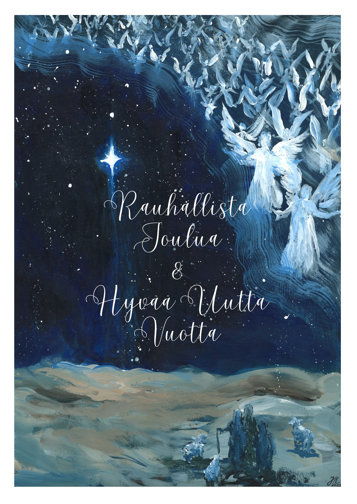 Gloria-maalauksesta painettu kortti kertoo joulun ilosanomasta enkelten laulamana: lupaus on täyttynyt, Kristus on syntynyt.