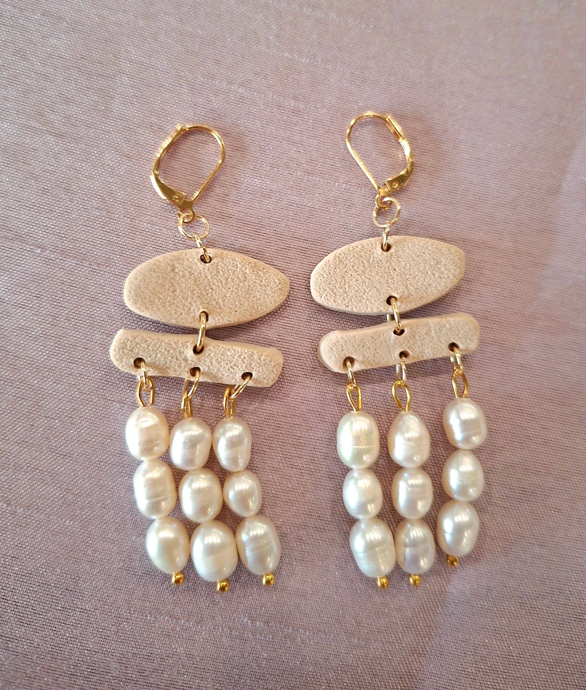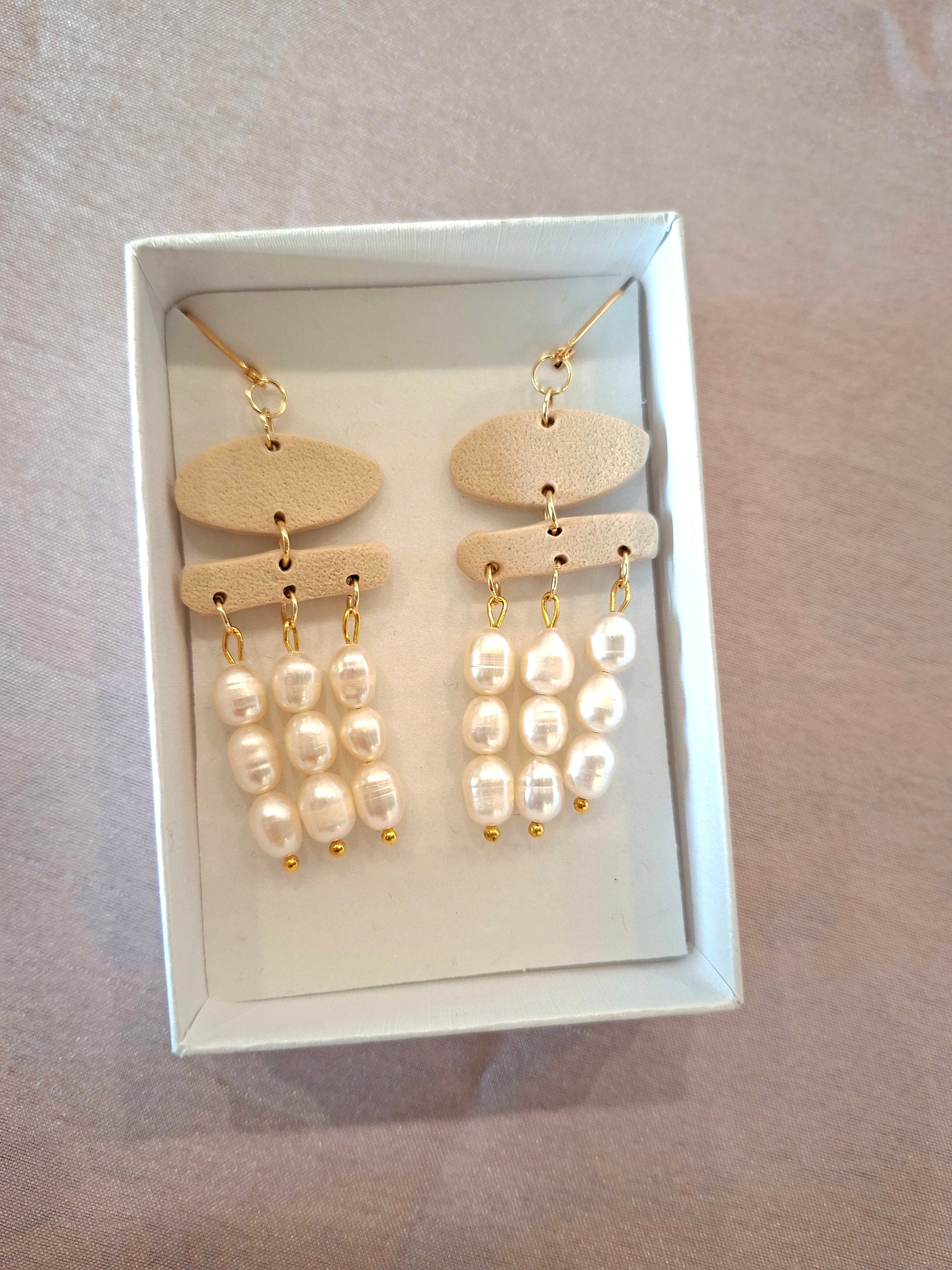 Materials: polymeerimassa, freshwater pearls. Metallic parts are nickel-tested gold-plated surgical steel.