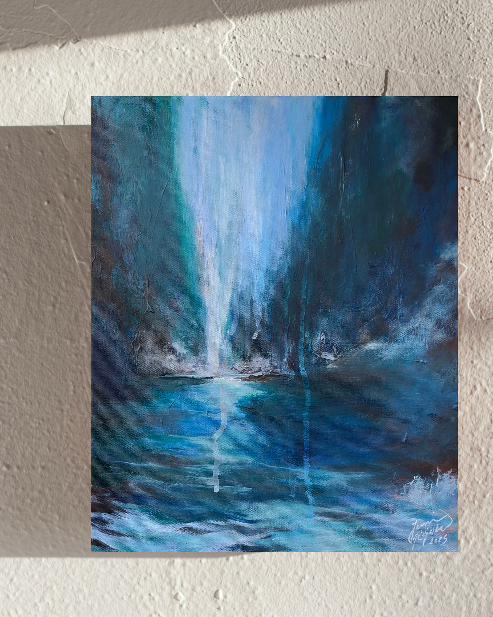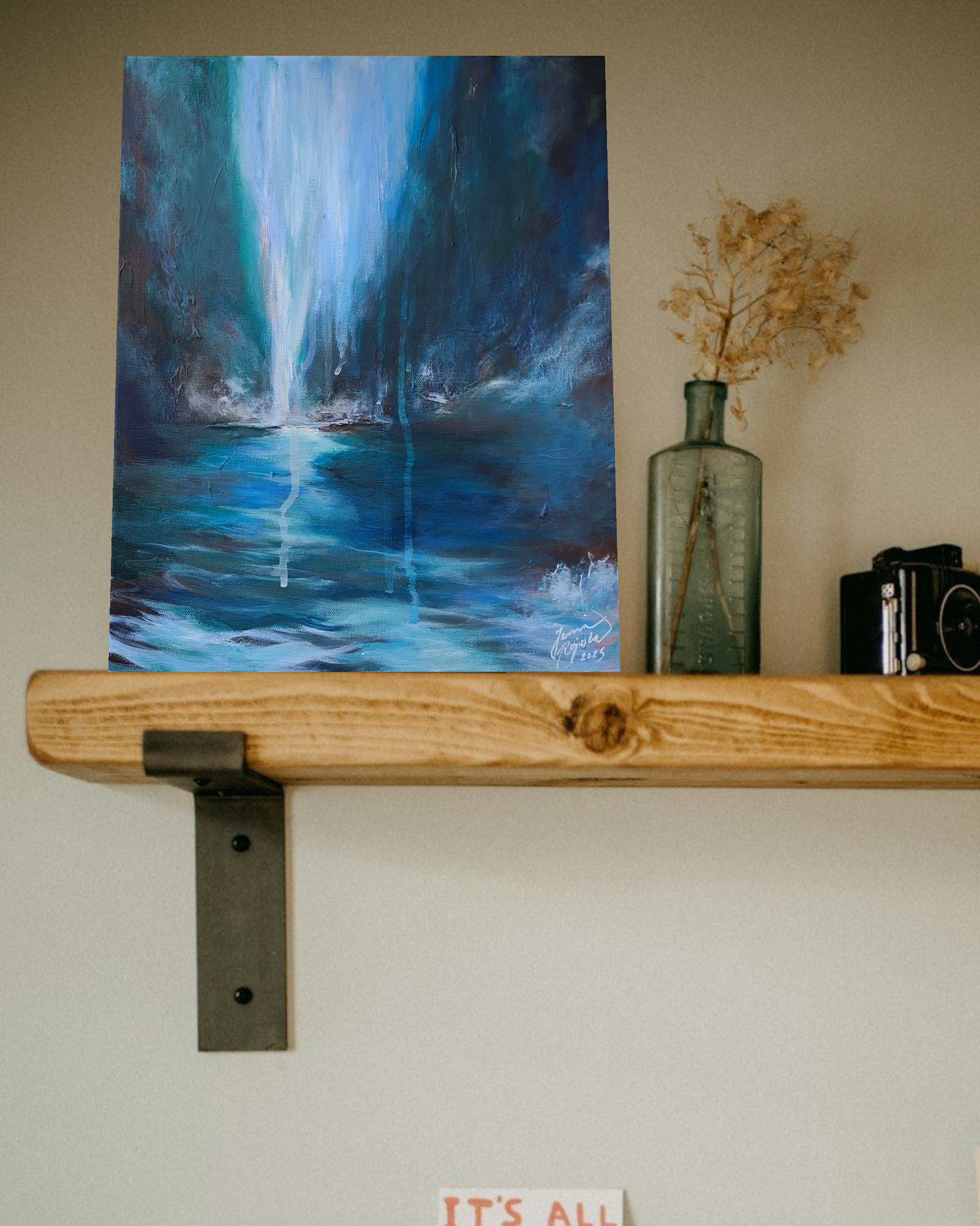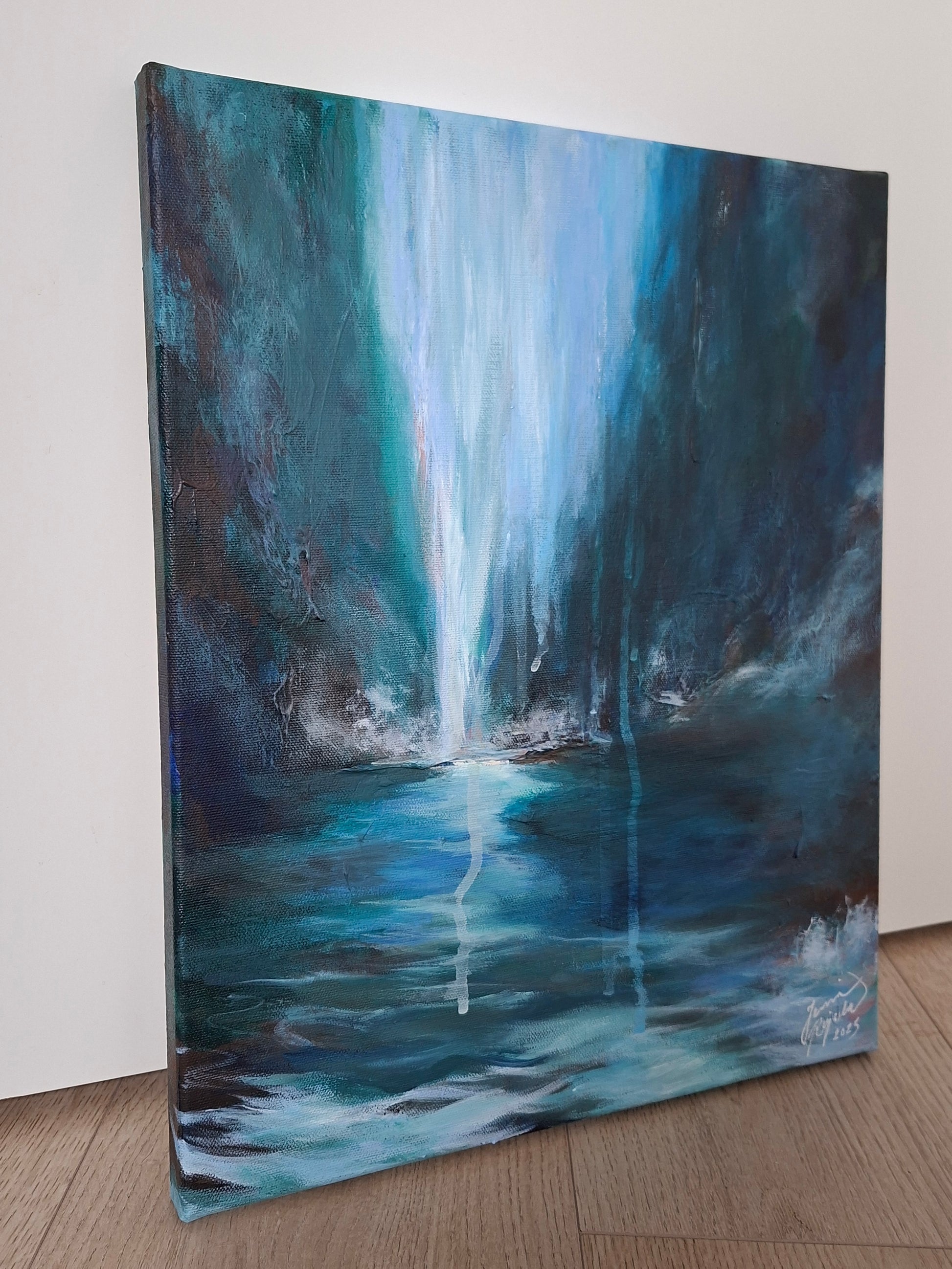 Maalaus jatkuu reunoille. Teos on viimeistelty vernissalla ja ripustusvalmis.