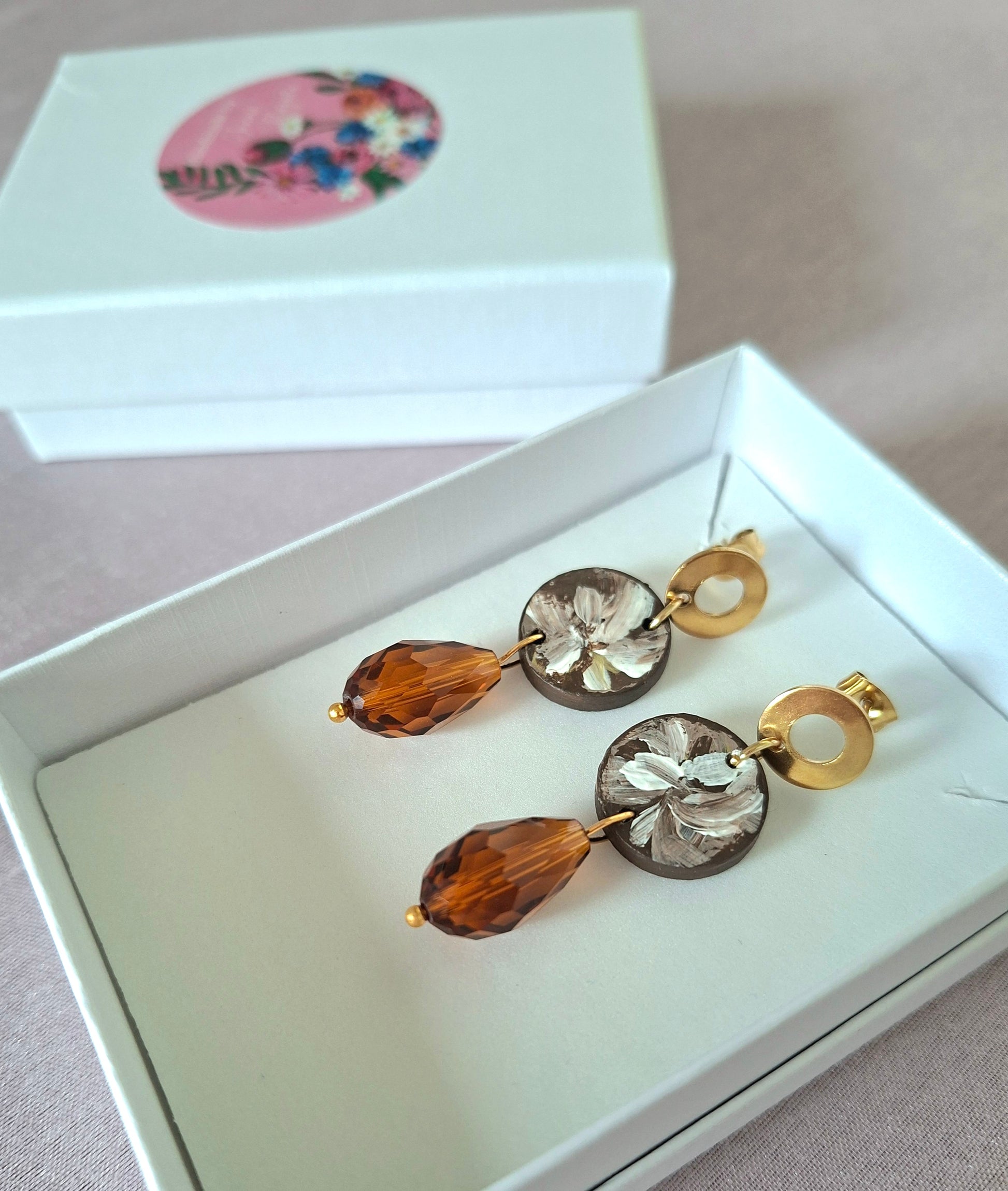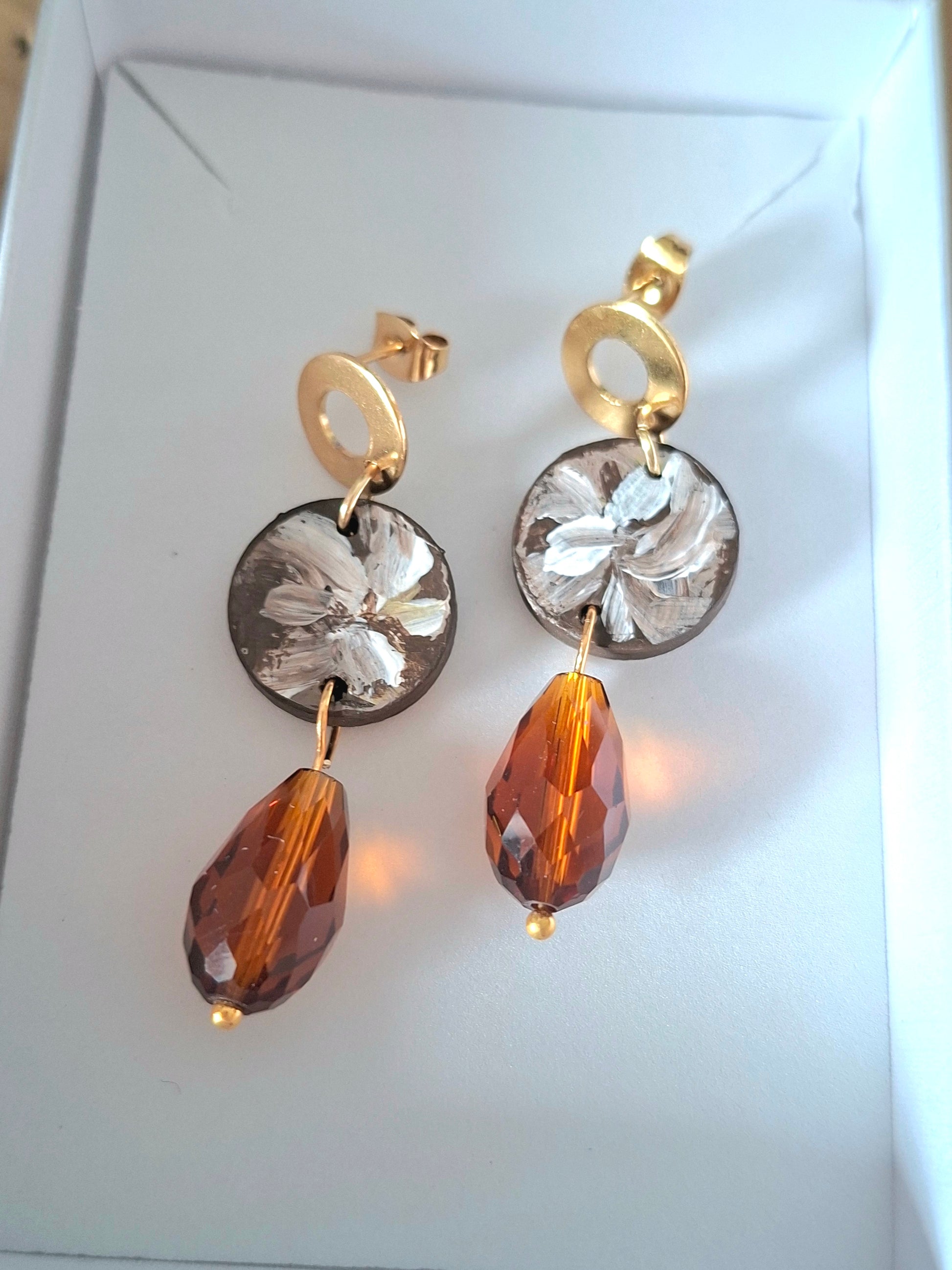 Materials: birch plywood with acrylic painting and light varnish, glass beads. Metallic parts are nickel-tested and gold-plated surgical steel.