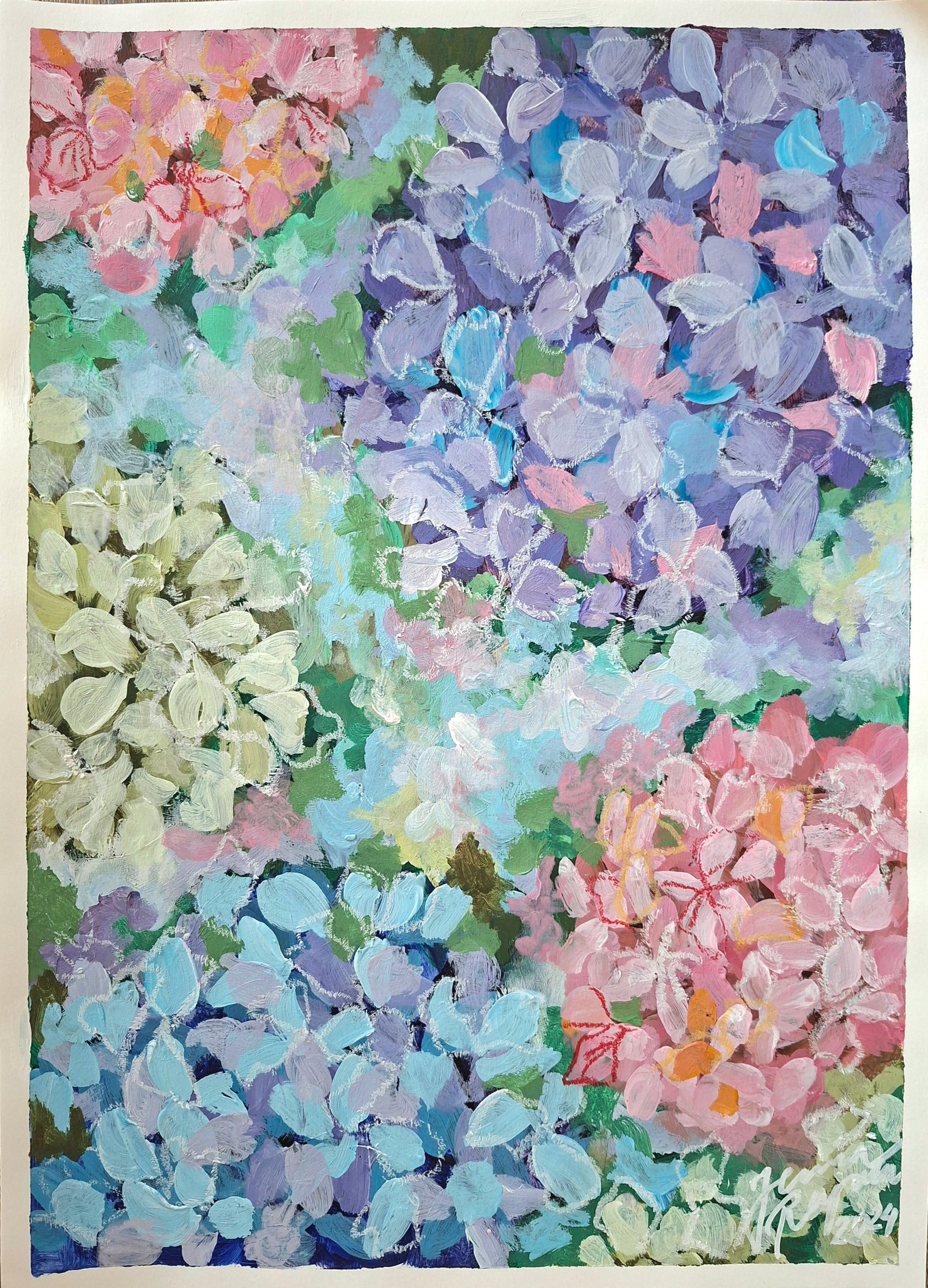 Akryylimaalaus öljypastellisilla yksityiskohdilla paksulle paperille.