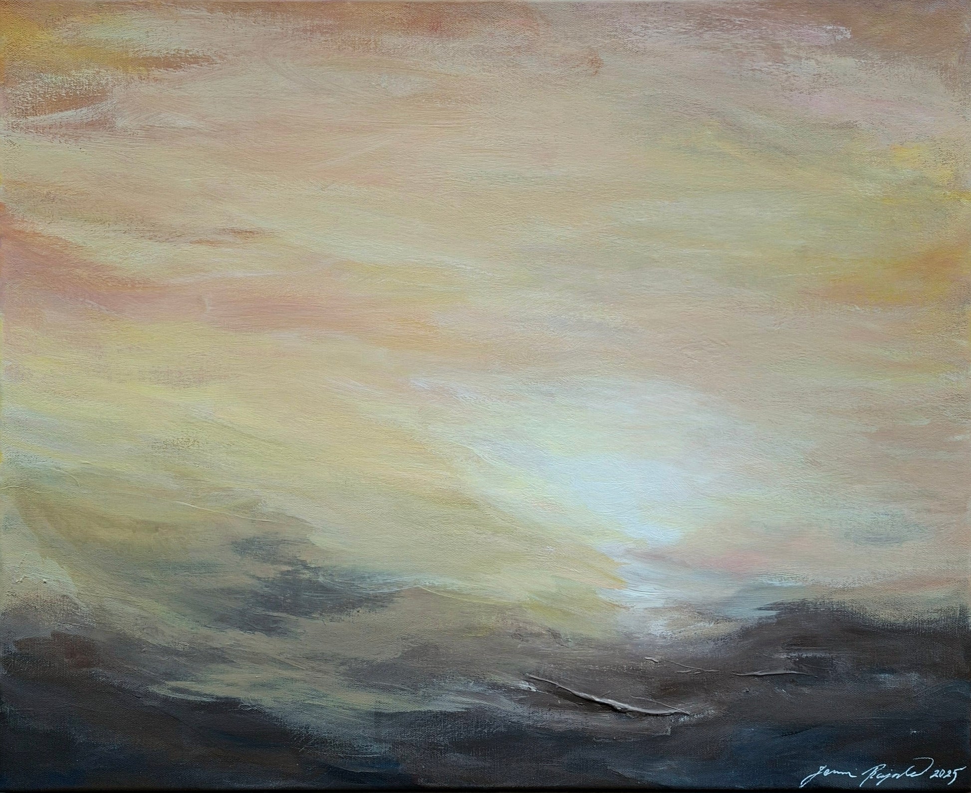 Maalaus jatkuu reunoille. Pinta on vernissalakattu ja maalaus on ripustusvalmis.
